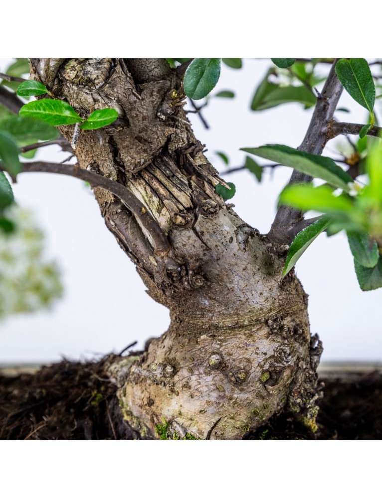 Pyracantha sp. Bonsái 14 años. Espino de fuego. Son árboles típicamente mediterráneos. Viven mejor en el exterior, ya que necesitan del sol y el frío para producir frutos. Árbol de hoja perenne. Muy apreciado por sus flores blancas en primavera y sus frutos de vivos colores en otoño.