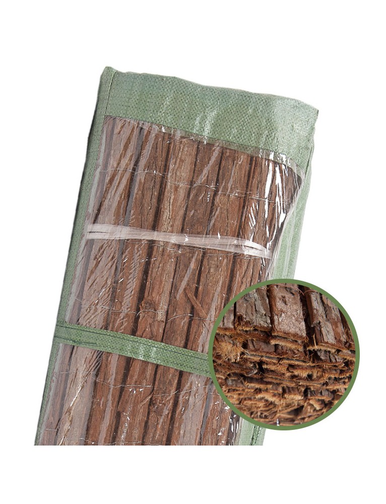 Cerramiento rústico con un valor estético excepcional. Se compone a base de láminas de corteza de abeto natural de un tamaño de 3,5 cm, cosido con alambre galvanizado (plastificado marrón) a 10 cm. de distancia.