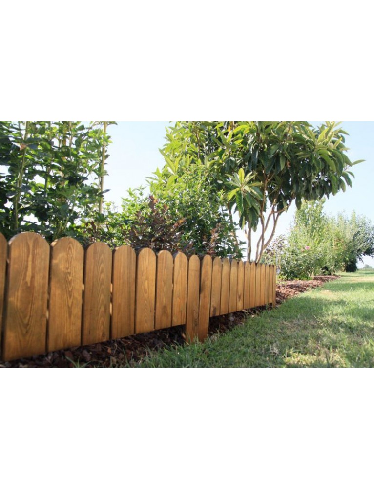 Mini valla en madera de coníferas impregnada en autoclave de color castaño, que consta de tiras planas de sección. 1,5 x5 cm. Es aconsejable perforar previamente el suelo donde se insertarán los puntales.