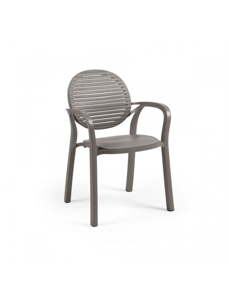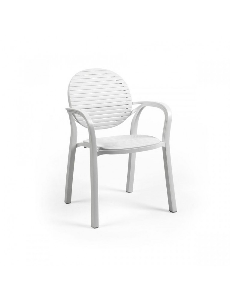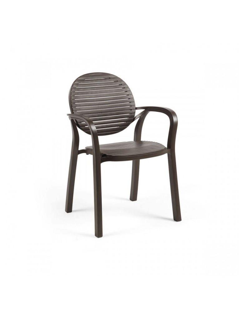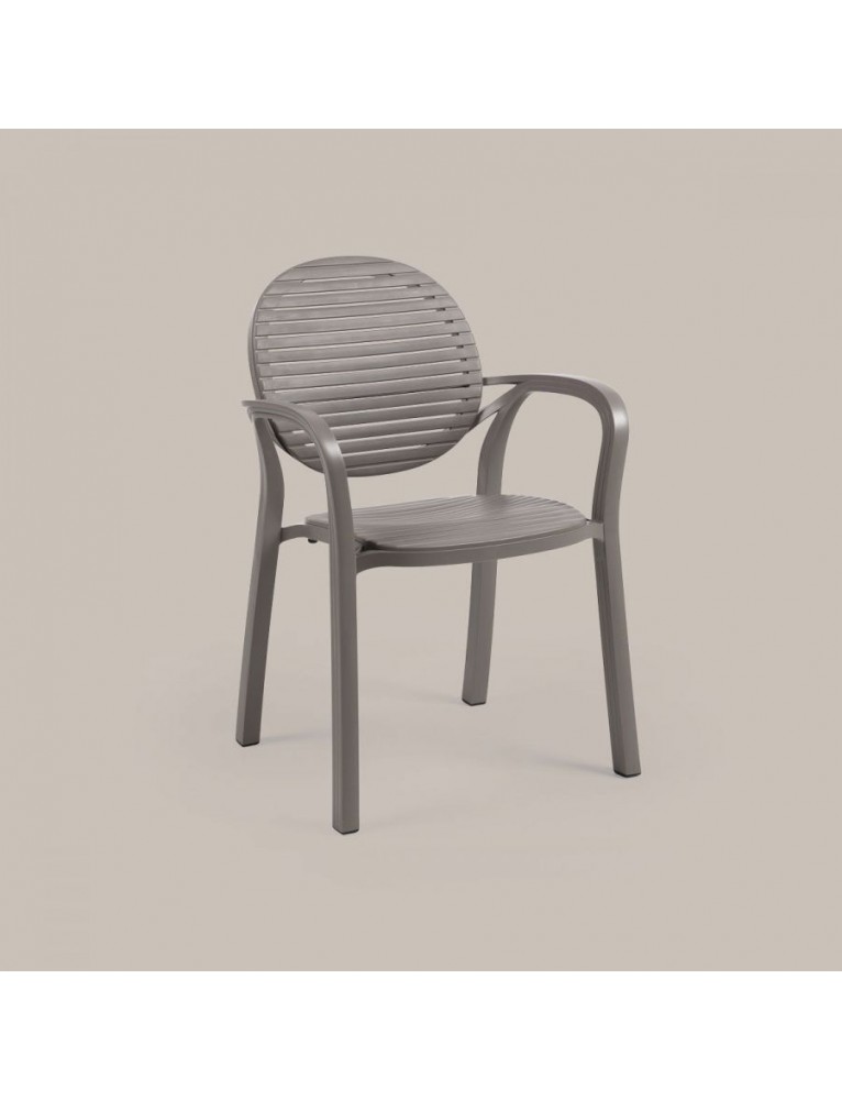 Diseño fresco y ligero para Gardenia, silla con brazos de resina con líneas acogedoras y con una estética que recuerda el estilo retro de las sillas con duelas de madera. Disponible en diversos colores.