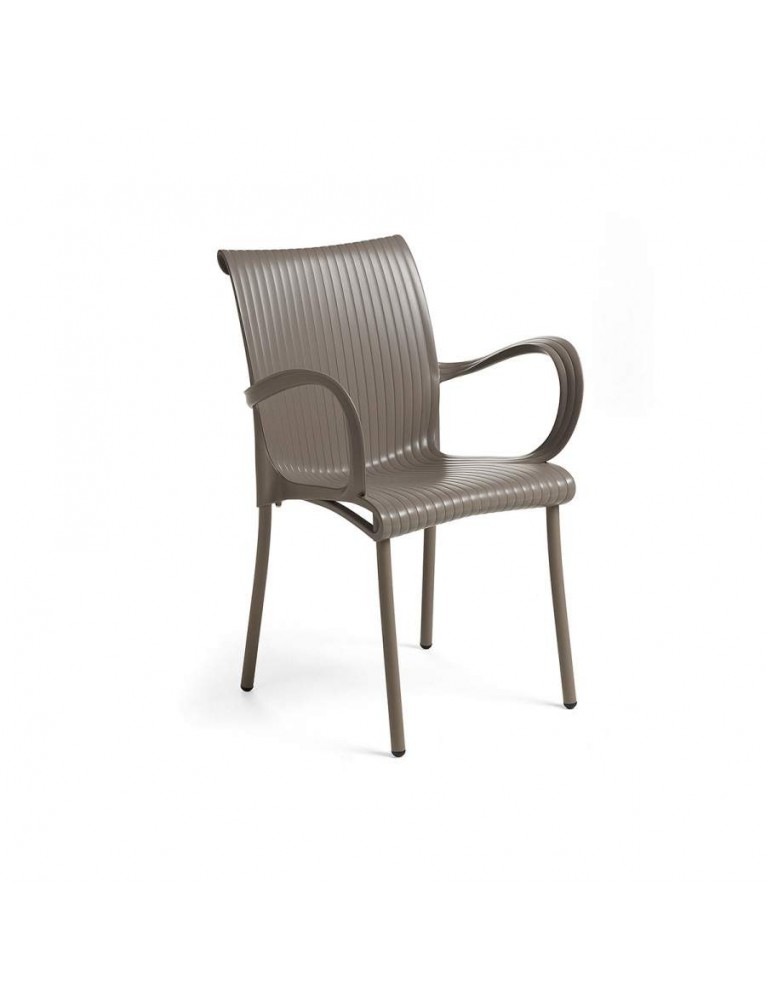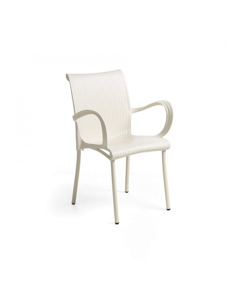 Silla con brazos. Polipropileno fiberglass tratado anti-UV y teñido en masa. Patas en aluminio pintado. Efecto mate. Con tapones antideslizantes. Resina reciclable.