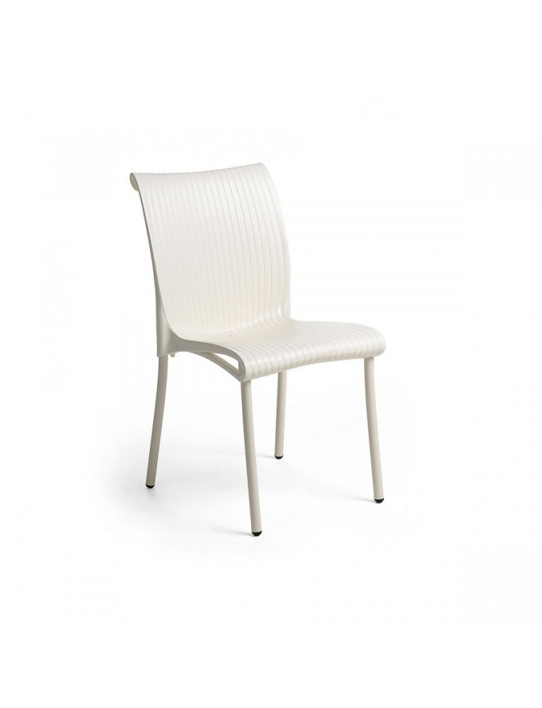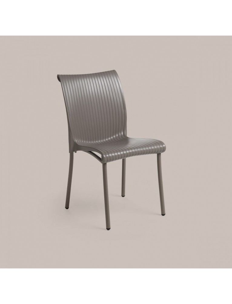 Silla sin brazos. Polipropileno fiberglass tratado anti-UV y teñido en masa. Patas en aluminio pintado. Efecto mate. Con tapones antideslizantes. Resina reciclable.